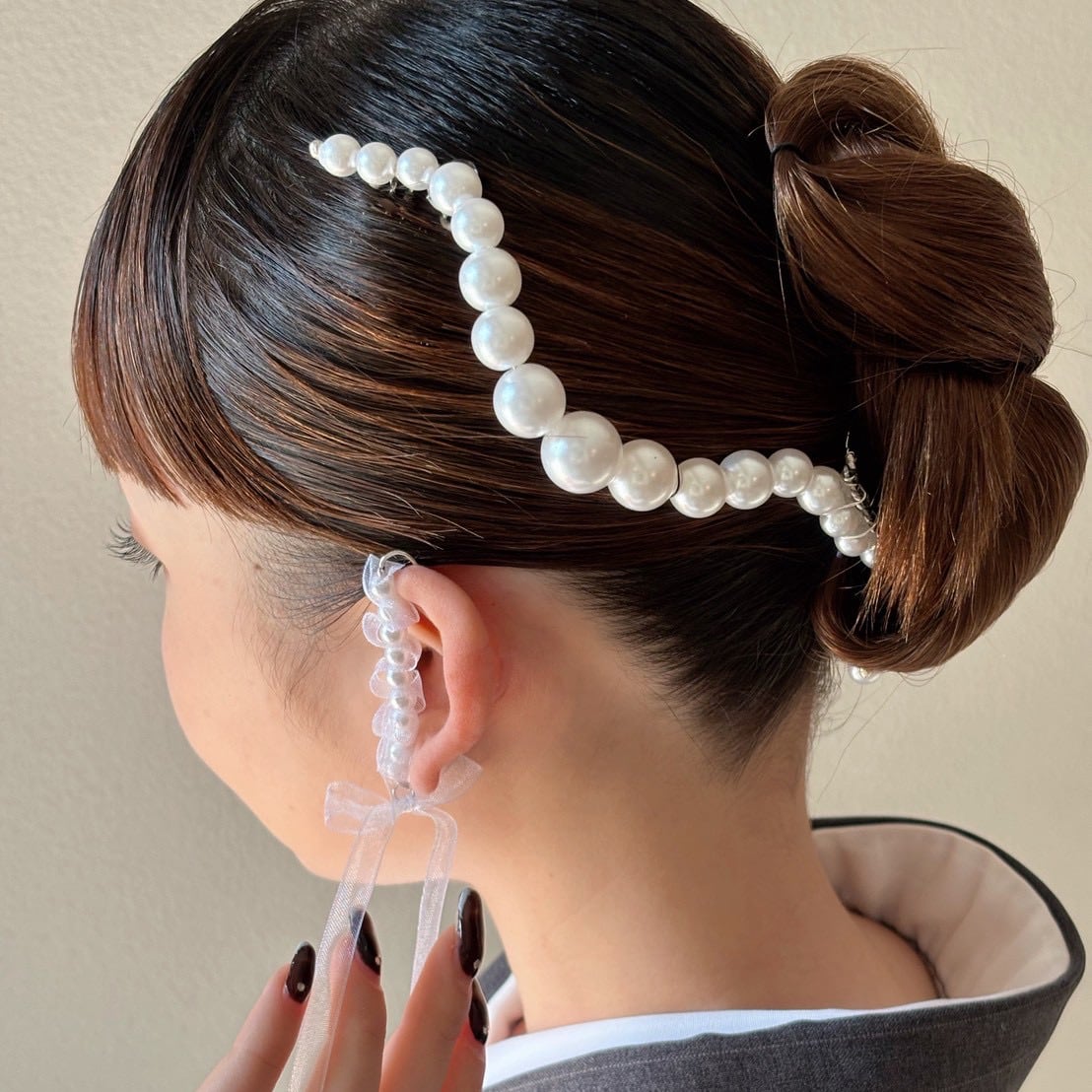 小粒のパールとオーガンジーリボンのイヤーカフです。