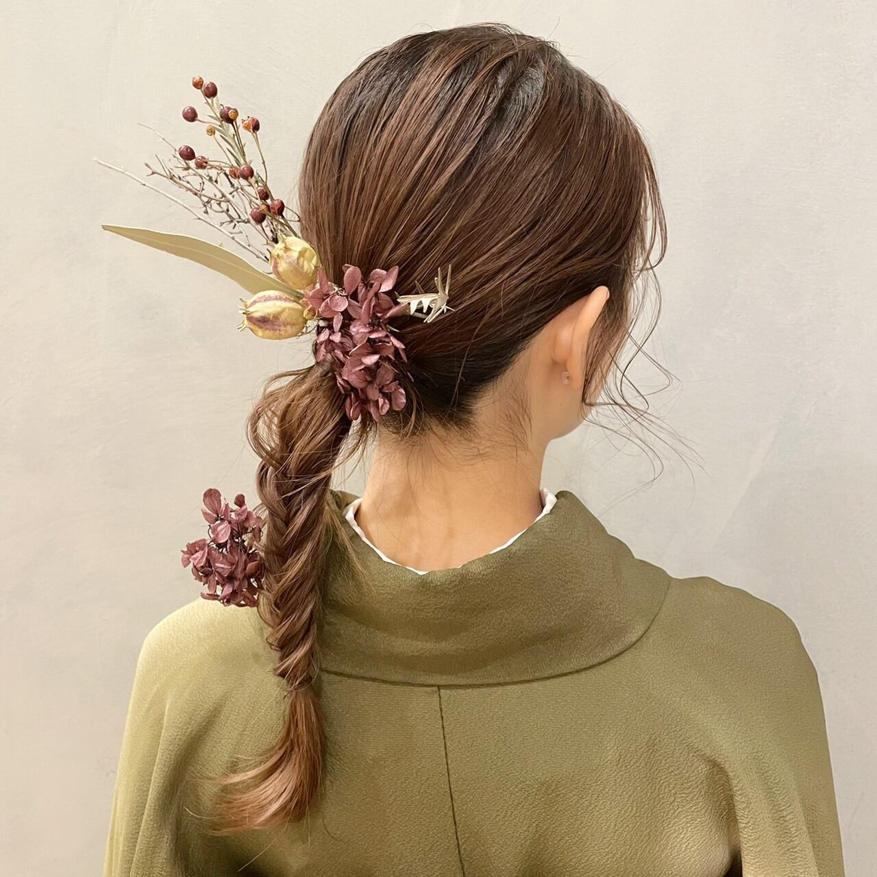 ドライフラワーとプリザーブドフラワーのヘアピースです。